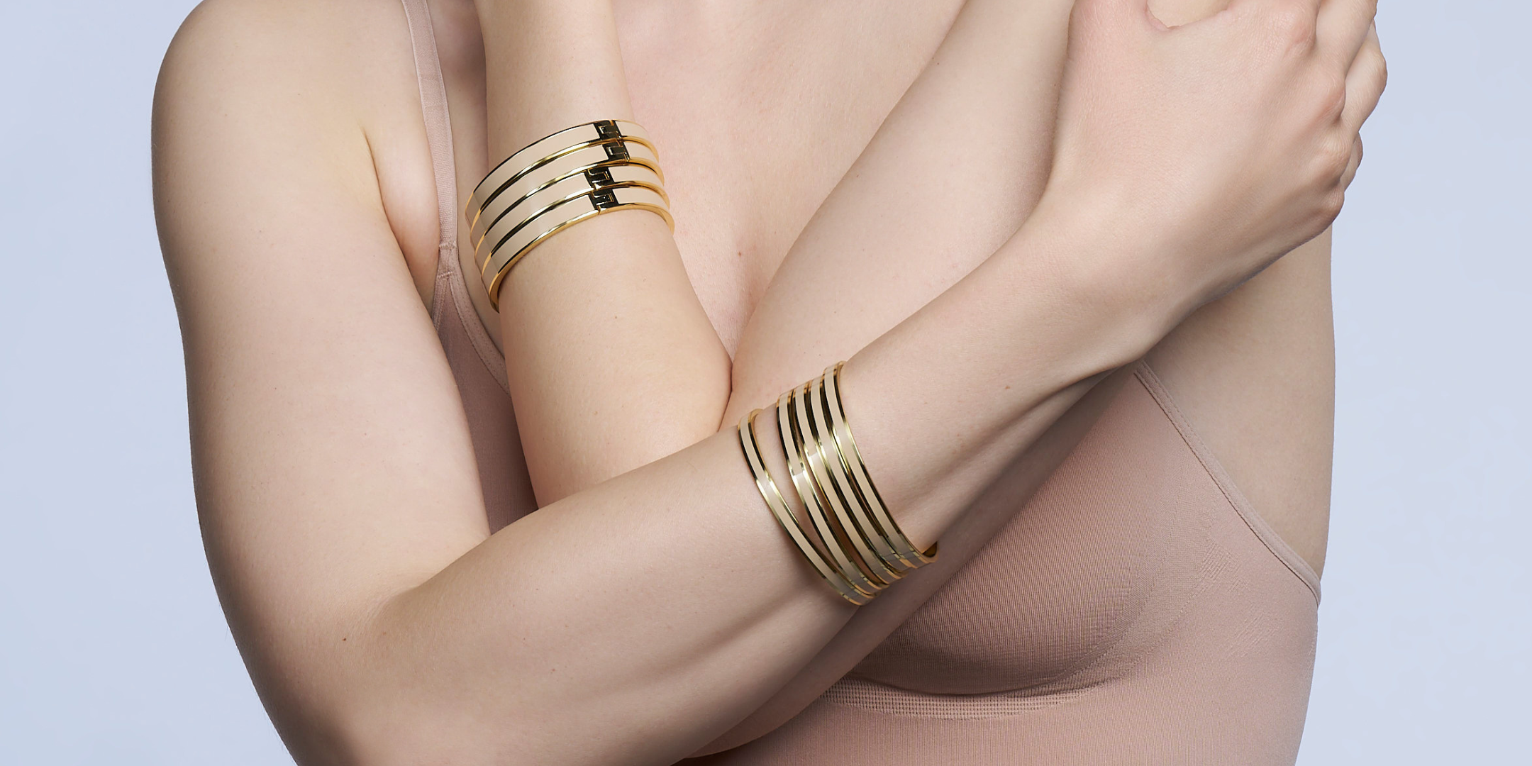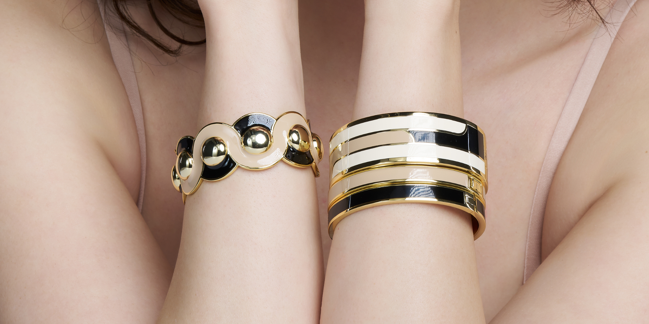 Bijoux singuliers, ils se caractérisent par leur design maison épuré, par leurs motifs cloisonnés ainsi que par leurs imprimés identitaires déclinés dans plusieurs coloris. Joyeusement modulables, ils s’articulent à travers une diversification de portés baptisée : le up-wear ou s’expriment librement en solo.