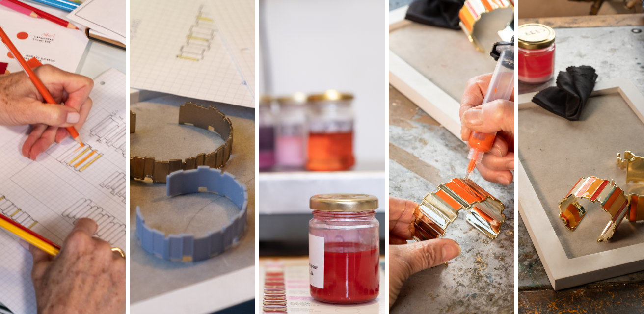 Bijoux en laiton, rehaussés à l’or fin, les créations de Bangle-Up résultent du processus artisanal de la laque et de l’émail en résine époxy. Ils sont façonnés, mis au point et réalisés en 3D dans un atelier qui dispose de sa propre usine à Paris. Les pièces sont ensuite produites chez un partenaire dédié en Asie où le savoir-faire de la main est intimement lié à l’ingénierie industrielle.