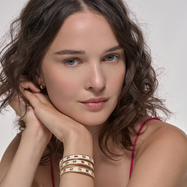 Sobres et raffinés, actuels et intemporels, nos « Bangle » cultivent subtilement l’harmonie des contraires. Bangle-Up s'inspire de la forme originelle du « Bangle » et propose des imprimés colorés. Un « parti-print » qui d’emblée a fait sa singularité́ ! Ce classique, au fil du temps, s’est constamment renouvelé́. Il s’est d’abord réinventé́ à travers des motifs différenciants puis, il s’est progressivement décliné́ en une famille de pièces complémentaires : des joncs, des manchettes, des bagues, des boucles d’oreilles et des colliers.