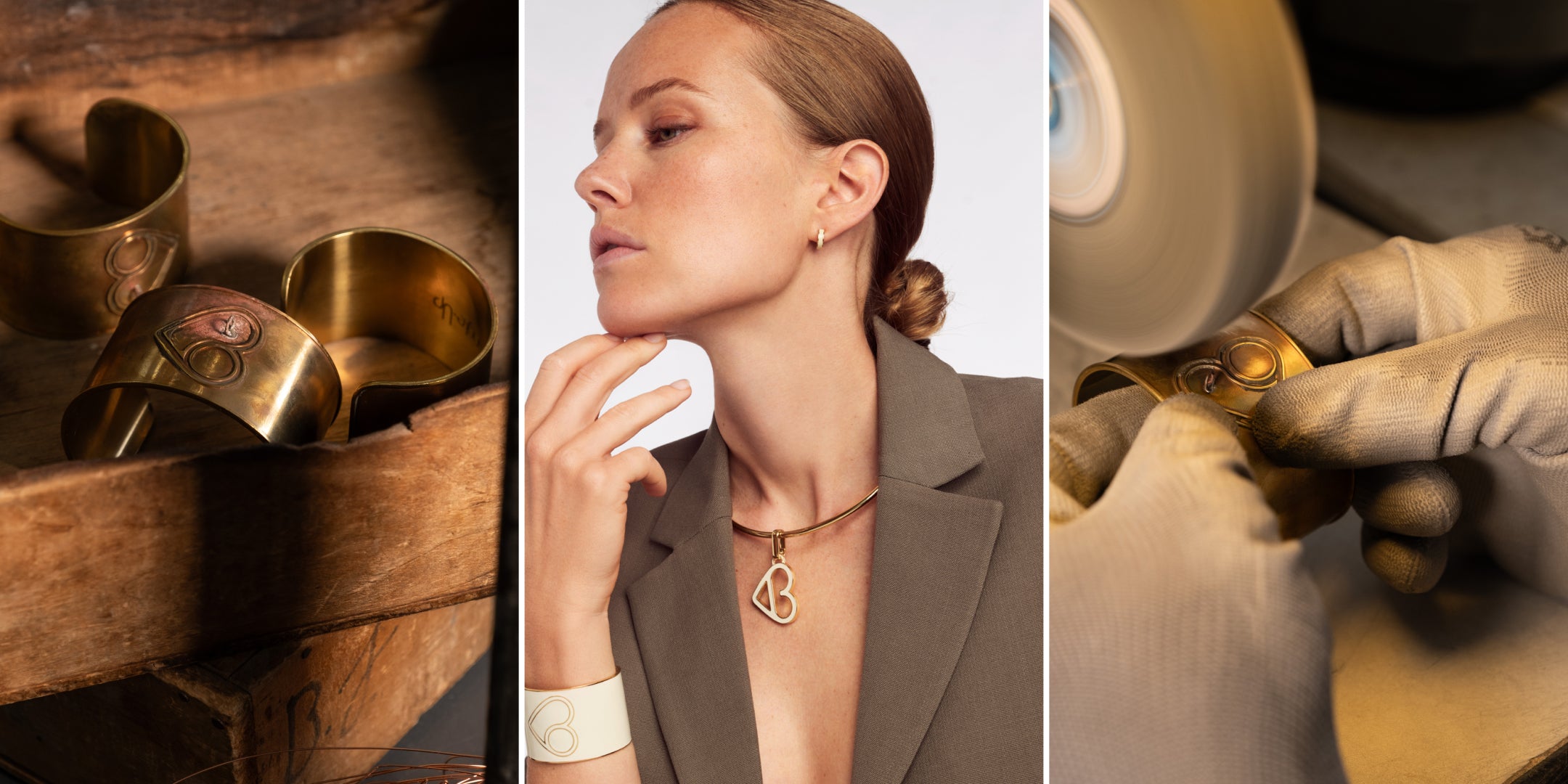 - Manchette cloisonnée au motif emblématique B.HEART en laiton, finition or et laque colorée.
